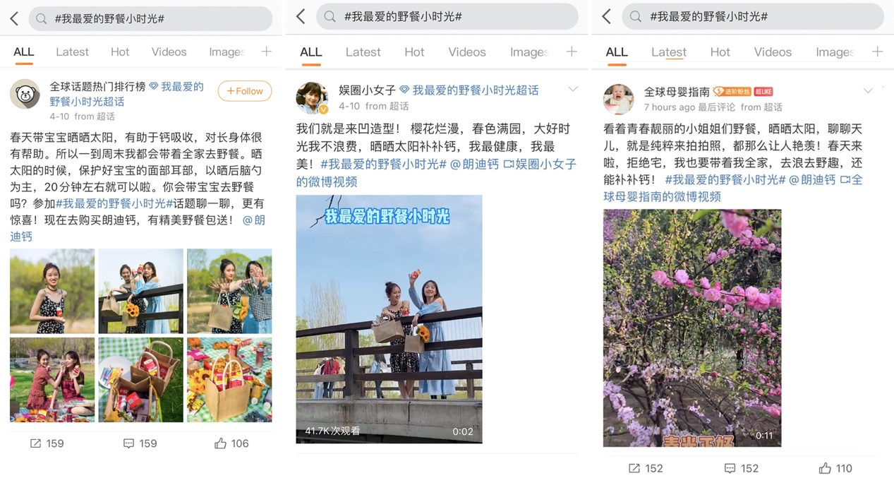 #我最爱的野餐小时光#微博活动一上线,便吸引了一百位多位育儿博主、时尚达人等的关注与参与。他们纷纷与朋友、家人出游,在野外铺上格子餐垫,沐浴着阳光,聊聊天,拍拍照,与春色相映成趣,成为一道靓丽的风景线!
